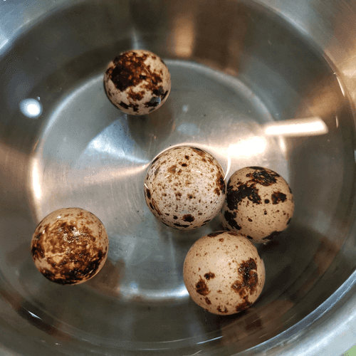 Перепелиные яйца отварить вкрутую, затем остудить.