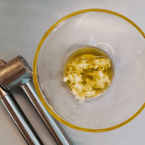 Влить масло в глубокую миску, добавить чеснок, выжатый через пресс.