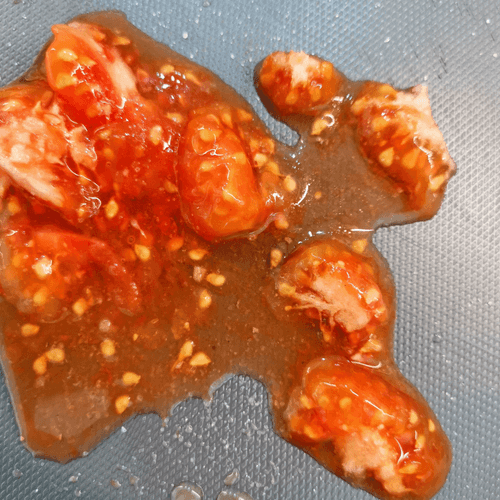 Достать ложкой мякоть из помидора. Посолить.