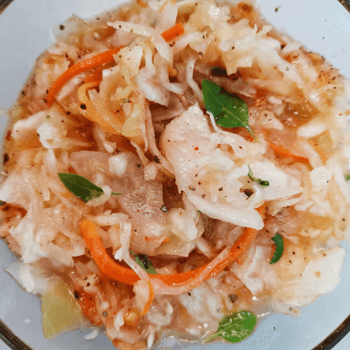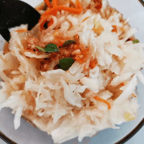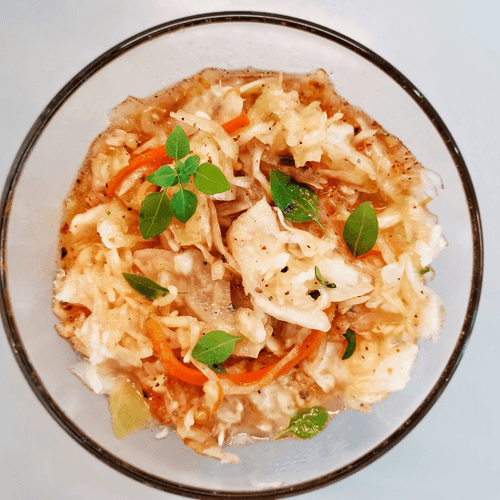 Салат из квашеной капусты с пряными специями и базиликом — это настоящее гастрономическое приключение. Вдохновленный традициями ферментации, он объединяет кисловатую свежесть капусты с насыщенными ароматами восточных специй и нежной зеленью базилика. Оливковое масло, чеснок и сумах придают блюду пикантность, а орегано и смесь перцев раскрывают его глубину вкуса. Этот салат идеально дополнит мясные и овощные блюда, оживляя стол своей яркостью и интенсивностью. Легкий, но с характером, он хорош и сам по себе — прекрасный выбор для любителей насыщенных вкусовых сочетаний. Прекрасно подходит как закуска или гарнир, особенно в сочетании с традиционным хлебом или легкими блюдами средиземноморской кухни.
