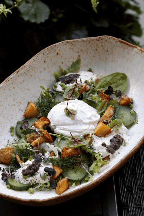 На тарелку выложить шпинат, огурец, картофель с лисичками и яйцо пашот.