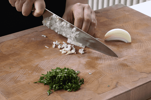 Мелко порубить лук и петрушку.