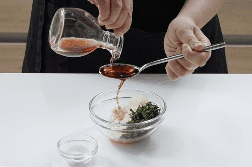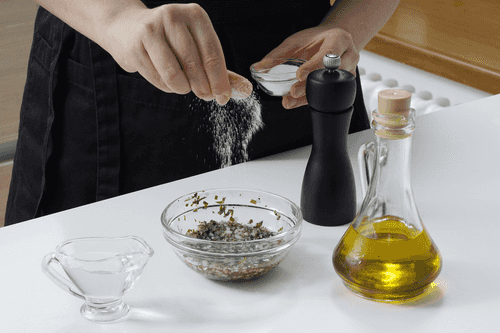 Добавить соль, перец, оливковое масло и 2 чайные ложки воды. Снова перемешать.