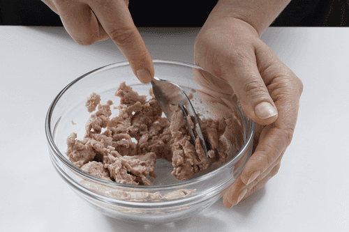 Поломать печень трески вилкой на небольшие кусочки.