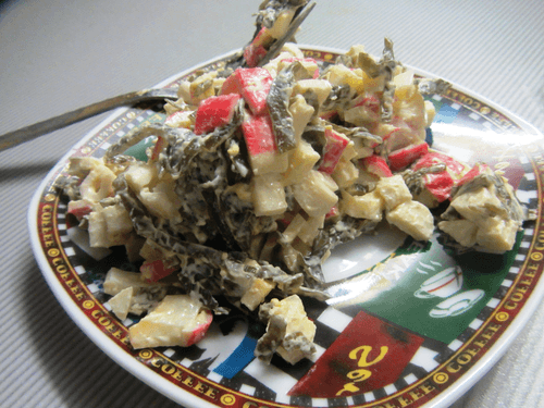 Перед подачей уложить морскую капусту горкой в салатник, вокруг разложить нарезанные крабовые палочки, сверху — лук. Оформить дольками яиц, сваренных вкрутую, майонезом и зеленью петрушки.