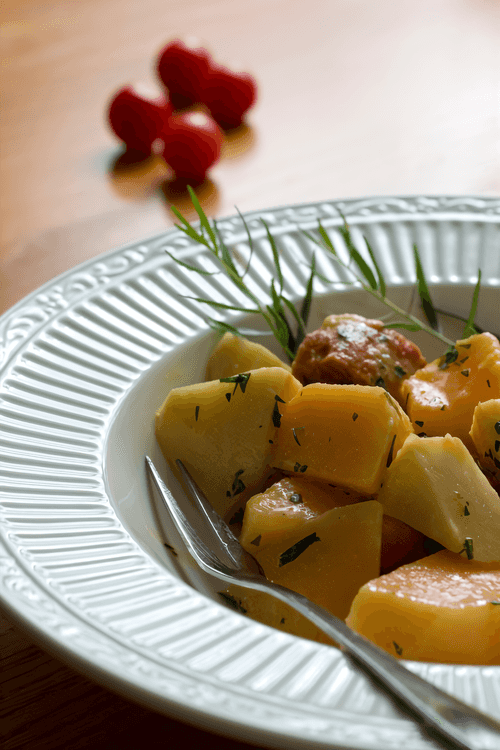 Салат из тыквы, дыни, яблок и лимона – это истинное воплощение свежести и легкости. Вдохновленный традициями русской кухни, этот салат сочетает в себе сладость медовой тыквы, сочность дыни и яблок, а также освежающую кислинку лимона. Такое сочетание вкусов создает гармоничный и освежающий десертный салат, который идеально подойдет для летнего ужина или легкого перекуса. Его можно подавать как самостоятельное блюдо или дополнение к праздничному столу. Ломтики лимона, обрамляющие композицию, не только украшают блюдо, но и придают пикантный цитрусовый акцент. Этот салат – идеальный выбор для тех, кто ценит натуральные вкусы и пользу фруктов.