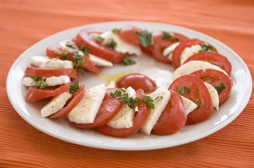 Разложить на тарелке, чередуя томаты и сыр.