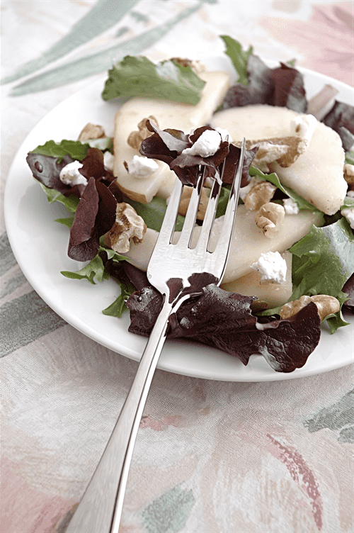 Теплый салат из груши и грецкого ореха с гренками и заправкой из сыра рокфор