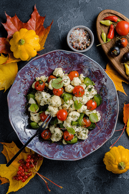 Разобрать свежую цветную капусту на мелкие соцветия (можно немного кочерыжек мелко нарезать и добавить к соцветиям). У головки чеснока отрезать донце с корешками и, не очищая, нарезать чеснок вместе с молодой шелухой. Мелко нарезать стебли укропа и отправить в салат. У помидоров черри отрезать плодоножки и отправить их в блюдо.