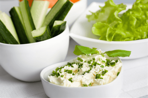 Перемешать с очищенным от семян, мелко нарезанным огурцом, также мелко нарезанными луком и травами.