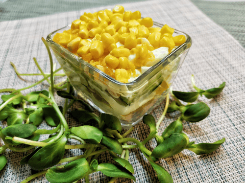 Салатник лучше взять прямоугольной формы, чтобы слои получились равными. Выложить ингредиенты слоями, промазывая майонезом, в такой последовательности: курица, ананасы, огурцы. Отставить на 15–20 минут, потом сверху выложить слои яйца и кукурузы.