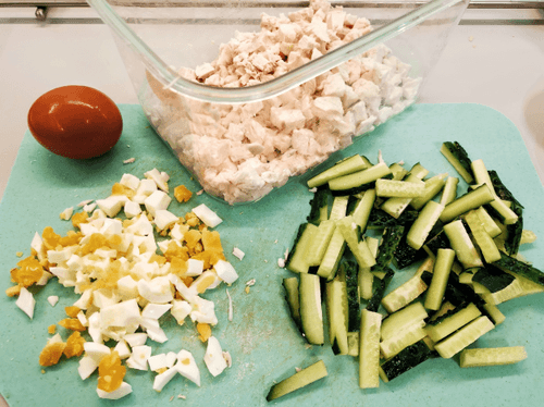 Куриное филе отварить и разделить на волокна или нарезать мелкими кубиками. Огурец порезать соломкой, яйца сварить вкрутую и мелко порубить.