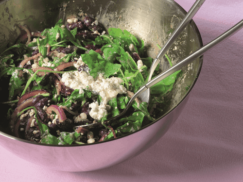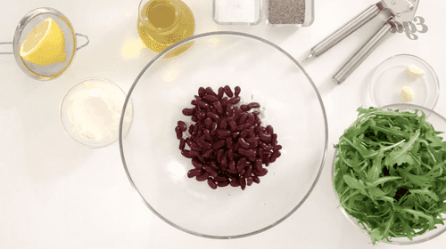 Готовую фасоль смешать с мелко нарубленным красным луком, зеленью, например, рукколы (которую для удобства поедания нужно предварительно изорвать руками), давленым чесноком, оливковым маслом, лимонным соком и творожным сыром.