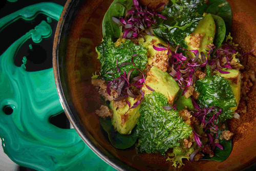 Этот насыщенный салат, в основе которого лежат авокадо, богатые жирами, и киноа, являющаяся отличным источником углеводов, обещает удивить. Хотя можно было бы просто добавить оливковое масло к этим ингредиентам и насладиться вкусом, шеф Борис Йованович из ресторана Community решил обогатить это сочетание дополнительными интересными компонентами.