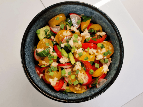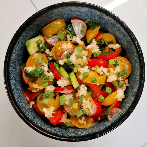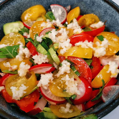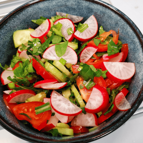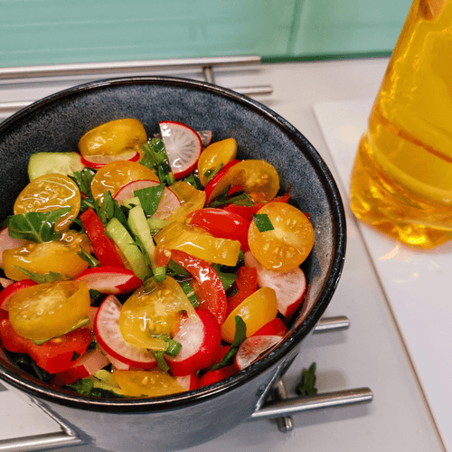 Салат «Черноморский» — легкое, освежающее блюдо, наполненное свежестью зелени и сочностью летних овощей. Его название отсылает к побережью Черного моря, где подобные блюда популярны благодаря обилию натуральных продуктов. Яркие красные и желтые томаты черри в сочетании с хрустящим редисом и огурцами создают гармоничную палитру вкусов. Рукола и шпинат придают салату пикантность и легкую горчинку, а чеснок добавляет нотку пряности. Заправленный ароматным нерафинированным подсолнечным маслом, этот салат идеально дополняет мясные и рыбные блюда, а также может стать самостоятельной закуской. Его свежесть делает его идеальным выбором для летнего обеда или легкого ужина, подчеркивая богатство русской кухни. Готовится просто, но оставляет яркое впечатление благодаря насыщенному вкусу и полезным свойствам.