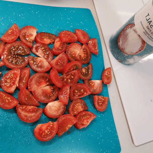 Нарезать черри тонкими ломтиками и посолить.