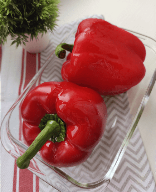 Болгарские перцы полить немного оливковым маслом и отправить в духовку на 40 минут. Оптимальная температура для запекания — 180 градусов.