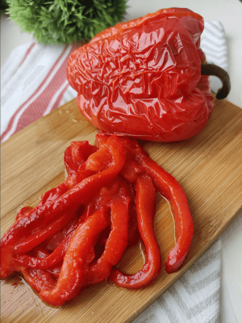 Остывшие перцы очистить от кожуры и семян, нарезать полосками.