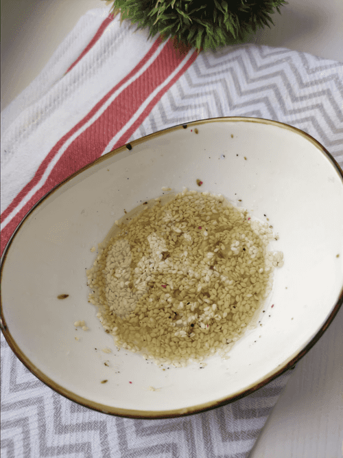 Добавить в заправку кунжут, воду, 1 столовую ложку оливкового масла, соль и перец по вкусу. Перемешать.