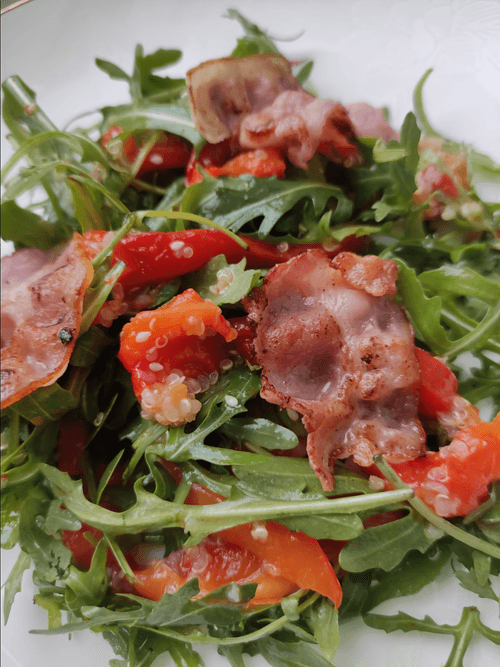 Салат с руколой, беконом, болгарским перцем и киноа
