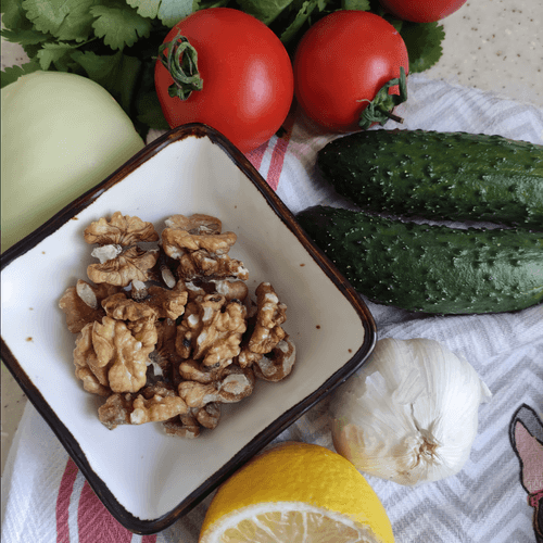 Овощной салат по-грузински – это яркое сочетание свежих овощей, ароматной зелени и насыщенных грецких орехов. Грузинская кухня славится своими насыщенными вкусами, и этот салат – прекрасное подтверждение. Огурцы и помидоры дарят сочность, белый лук добавляет пикантности, а соус из кинзы, чеснока, орехов и лимонного сока наполняет блюдо глубиной вкуса. Этот салат не только освежает, но и удивляет своей гармонией. Он отлично подходит как самостоятельное блюдо или как дополнение к мясным и рыбным угощениям. Грузинские традиции делают его обязательным элементом праздничного застолья, а его простота позволяет приготовить его в любое время, когда хочется чего-то легкого, но в то же время насыщенного.