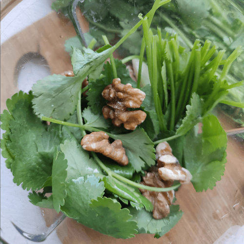 Промыть кинзу под проточной водой и сложить в блендер. Добавить грецкие орехи, чеснок.