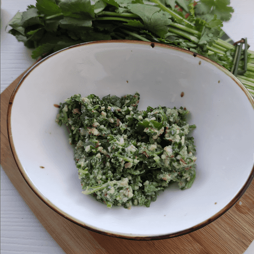 Измельчить кинзу, орехи, чеснок до однородной массы. Посолить по вкусу.