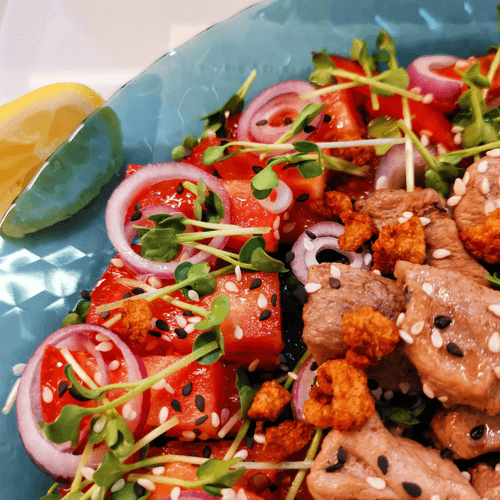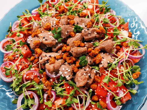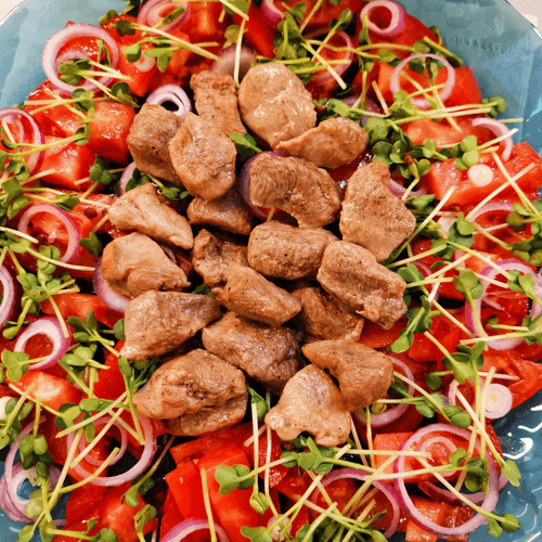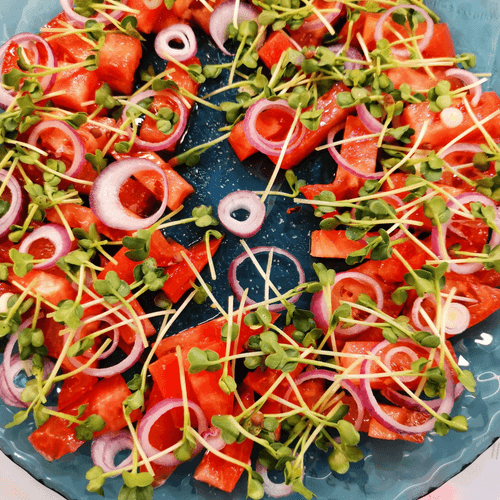 Нарезанный кубиками помидор выложить на тарелку, добавить нарезанный кольцами лук и микрозелень. Посолить.