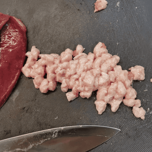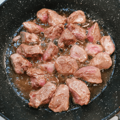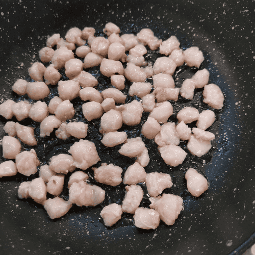 В растопившийся жир выложить некрупно нарезанную грудку и немного посолить.