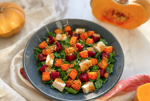 Отправить кусочки тыквы запекаться в духовку к свекле (минут на 10–15).