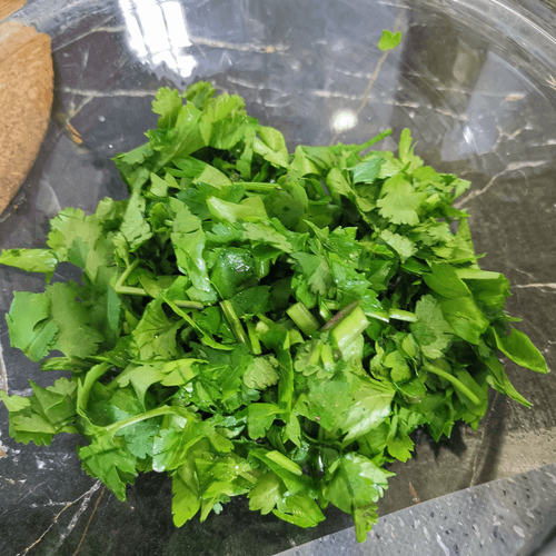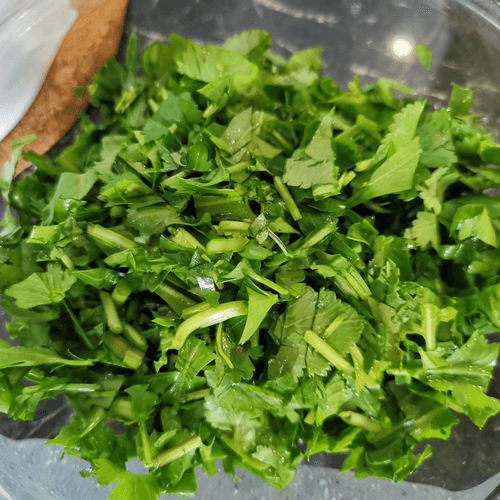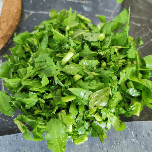 Помидор нарезать крупными кубиками. Объединить его с зеленью в глубокой миске. Посолить.