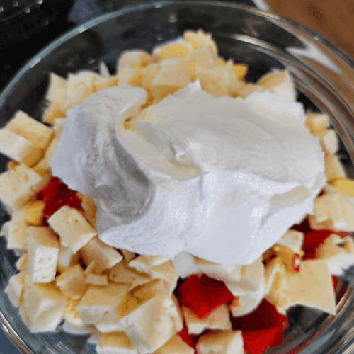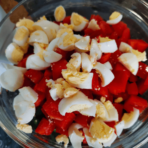 Чуть помельче нарезать болгарский перец и добавить его в салат.