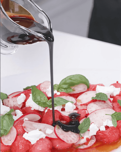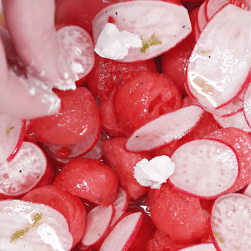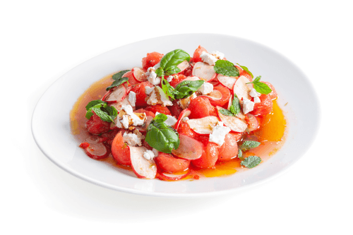 Салат с арбузом и редиской — изысканное сочетание свежести и пикантности, которое подарит летнее настроение даже в прохладные дни. Ярко-красные ломтики арбуза наполняют блюдо сочностью, а хрустящий редис добавляет легкую остроту. Вдохновленный средиземноморскими мотивами, этот салат объединяет в себе сладость фрукта, пряную свежесть базилика и мяты, пикантность чили и сливочную нежность брынзы. Заправка из оливкового масла и лаймового сока подчеркивает гармонию вкусов, а бальзамический соус добавляет благородные нотки. Идеальный вариант для легкого летнего ужина или оригинального дополнения к праздничному столу. Прекрасно сочетается с морепродуктами и белыми винами, создавая утонченное гастрономическое впечатление.