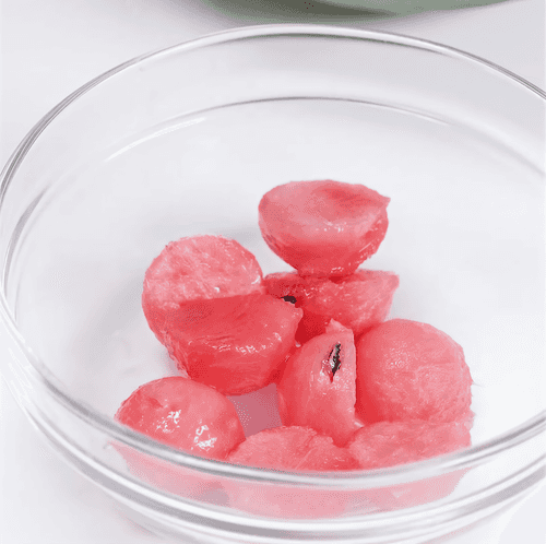 Арбуз очистить от кожуры. Нарезать арбуз небольшими ломтиками. Либо для нарезки можно воспользоваться нуазеткой.
