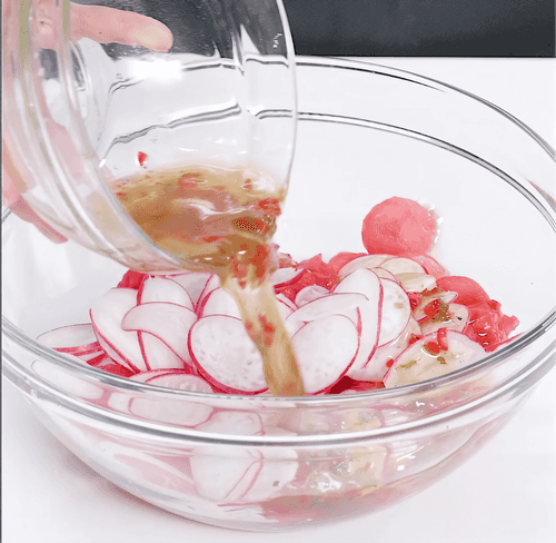 Смешать редис и арбуз с заправкой и выложить на блюдо.