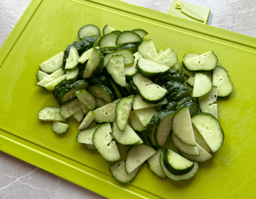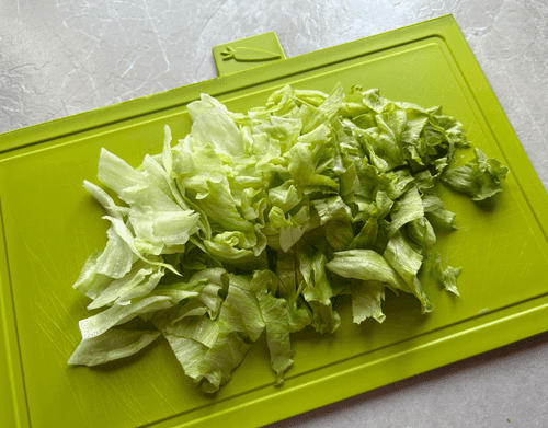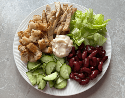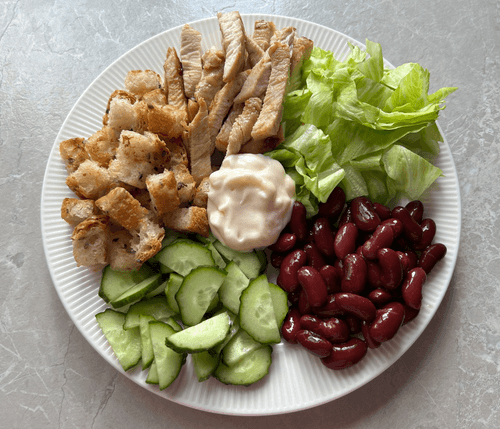 Собрать салат. Выложить на блюдо по кругу огурцы, сухарики, грудку, листья салата, фасоль. В центр положить майонез.