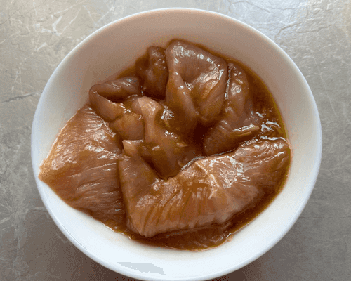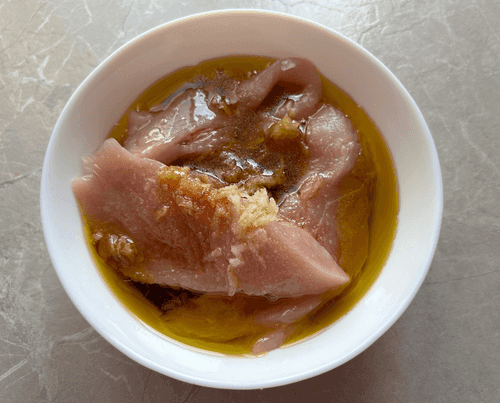 К грудке добавить оливковое масло (20 мл), чеснок, соевый соус, соль.
