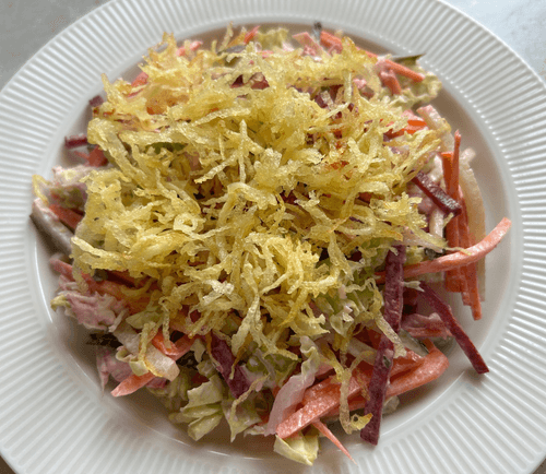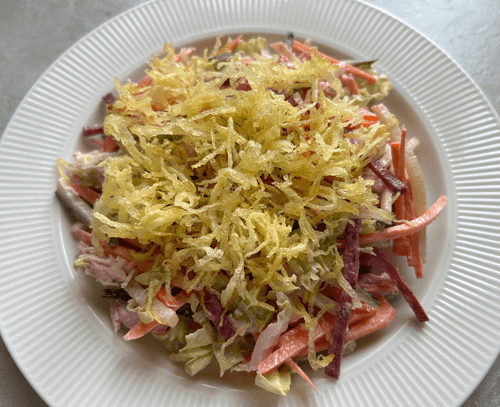 Овощной салат с курицей и картофелем пай – это яркое и хрустящее блюдо русской кухни, сочетающее в себе свежесть овощей, нежность курицы и золотистую хрусткость картофеля. Его происхождение связано с традицией использования доступных и простых ингредиентов, создавая при этом удивительную игру текстур и вкусов. Легкая кислинка свеклы, сочность огурца и моркови гармонируют с мягкостью пекинской капусты, а хрустящий картофель пай придает особую пикантность. Этот салат идеально подходит как самостоятельное блюдо или как гарнир к основным блюдам. Его можно подать на семейный ужин или праздничный стол, удивляя гостей неожиданным сочетанием простых компонентов, которые создают богатый и многослойный вкус.