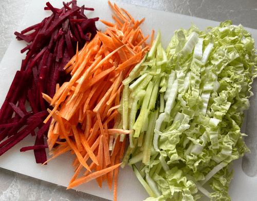 Пекинскую капусту, морковь и свеклу нарезать соломкой.