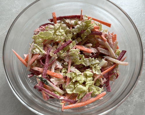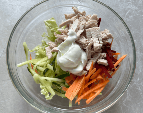Выложить в миску огурец, свеклу, морковь, пекинскую капусту, курицу и майонез.