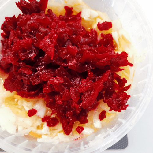 Добавить натертую на крупной терке отварную свеклу.