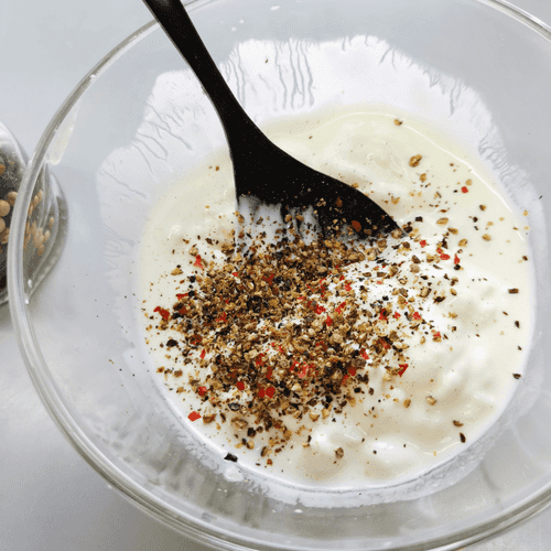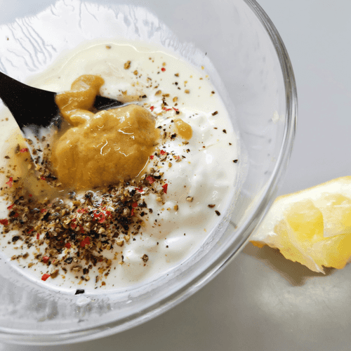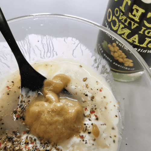 Затем добавить горчицу и сок маленькой дольки лимона.