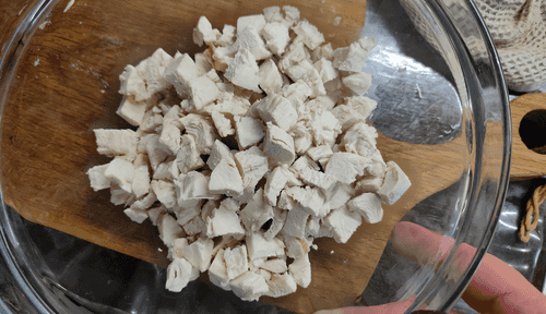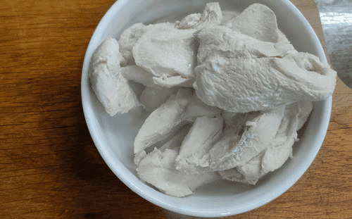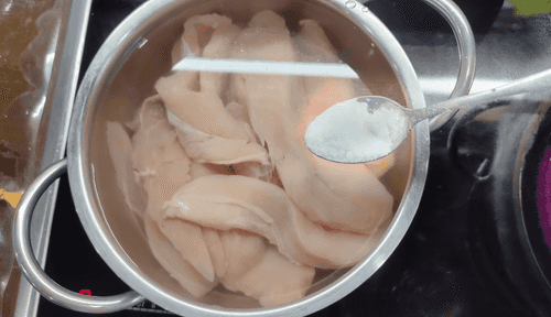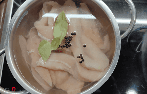 Куриную грудку нарезать небольшими кусками и поставить вариться, добавить соль.