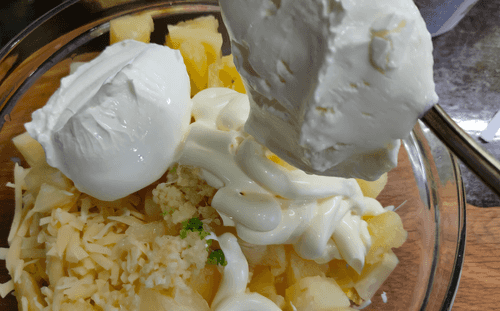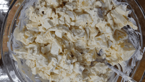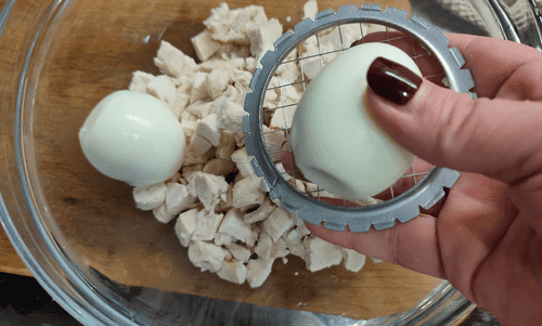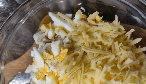 Вареные яйца остудить и нарезать ножом или при помощи специального приспособления, добавить к курице.
