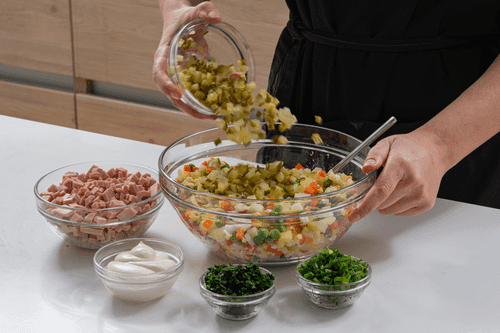 Классический салат «Оливье» с колбасой – это не просто блюдо, а настоящая гастрономическая легенда русской кухни. Его история берет начало в XIX веке, когда французский шеф-повар Люсьен Оливье создавал свой знаменитый салат с изысканными ингредиентами. Со временем рецепт претерпел изменения, адаптируясь к доступным продуктам. Нежное сочетание вареных овощей, соленых огурцов, вареных яиц и докторской колбасы придает салату сбалансированный вкус – мягкий, но с пикантными нотками маринованных огурцов. А майонез делает его сочным и насыщенным. Оливье – традиционное украшение праздничного стола, особенно в Новый год, символизируя уют, радость и теплые семейные вечера. Изысканный и простой одновременно, этот салат остается неизменным фаворитом поколений.