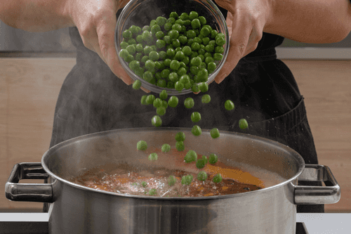 Добавить горошек, варить еще 1 минуту, а затем откинуть на сито.