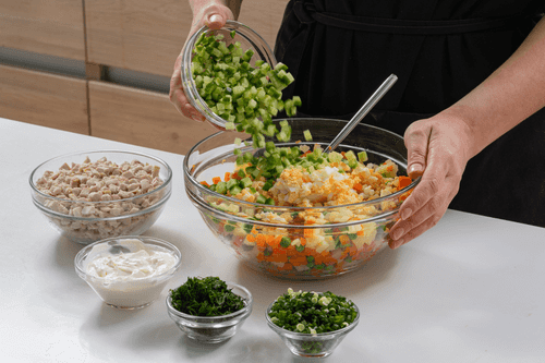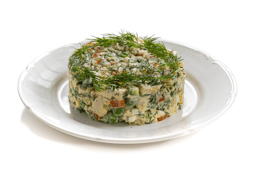 Классический оливье с курицей и свежими огурцами – это воплощение традиций русской кухни, объединяющее нежную курицу, хрустящие овощи и ароматную зелень. История этого салата уходит корнями в XIX век, когда французский шеф-повар Люсьен Оливье создал изысканное блюдо, которое со временем приобрело более демократичное исполнение. Вкус этого варианта – мягкий, сбалансированный, с освежающей ноткой огурца и сочной текстурой куриного филе. Оливье – неизменный гость праздничного стола, сопровождающий семейные торжества и уютные застолья. Его можно подавать как самостоятельное блюдо или в качестве дополнения к основным угощениям, идеально сочетается с мясными и рыбными закусками. Майонез со сметаной придает салату легкость, а зелень – изысканную свежесть. Классика, которая не стареет!