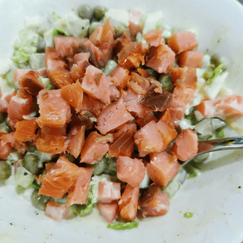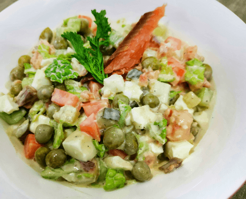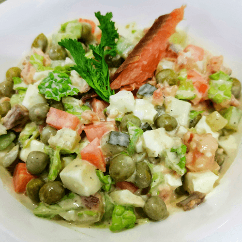 Оливье с горбушей – оригинальная авторская интерпретация классического салата. Вдохновленный традиционным рецептом, он обретает новое звучание благодаря горячему копчению горбуши, которая придает блюду легкую дымную нотку и нежность. Пекинская капуста освежает композицию, а сочетание соленых и свежих огурцов добавляет баланс вкуса. Яйцо, зеленый горошек и морковь сохраняют дух классического оливье, но благодаря горбуше салат становится более изысканным и питательным. Это блюдо прекрасно подойдет как для уютного семейного ужина, так и для праздничного стола, удивляя гостей новым прочтением знакомого вкуса. Заправленный нежным майонезом и приправленный морской солью и черным перцем, этот оливье обещает стать гастрономическим открытием для ценителей нестандартных решений в кулинарии.
