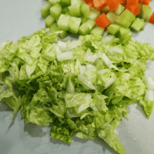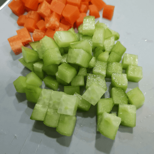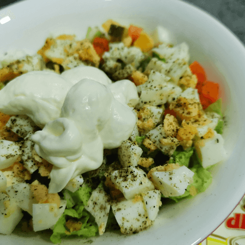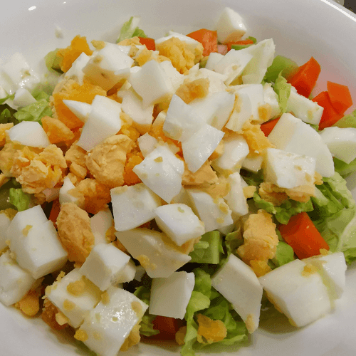 Отварное яйцо нарезать небольшими кубиками и добавить в салат.