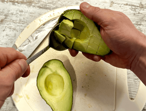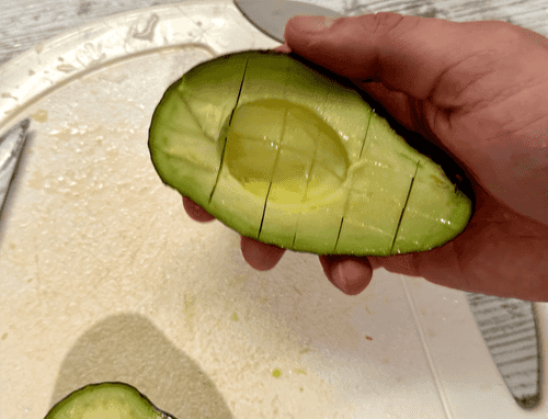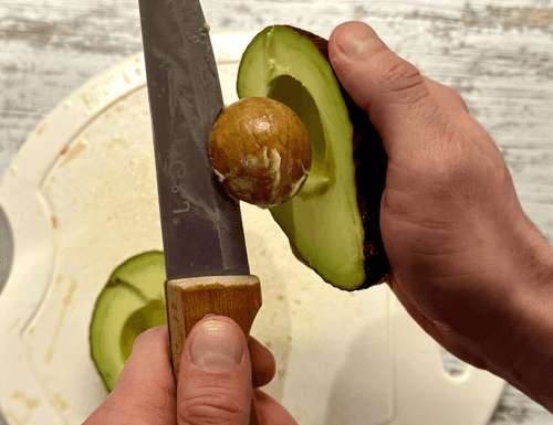 Авокадо разрезать пополам и извлечь косточку при помощи ножа.